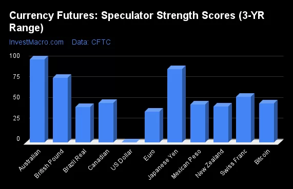 COT Strength Scores (a normalized measure of Speculator positions over a 3-Year range, from 0 to 100 where above 80 is Extreme-Bullish and below 20 is Extreme-Bearish) showed that the Australian Dollar (100 percent) and the Japanese Yen (88 percent) lead the currency markets this week. The British Pound (78 percent) and the Swiss Franc (55 percent) come in as the next highest in the weekly strength scores.