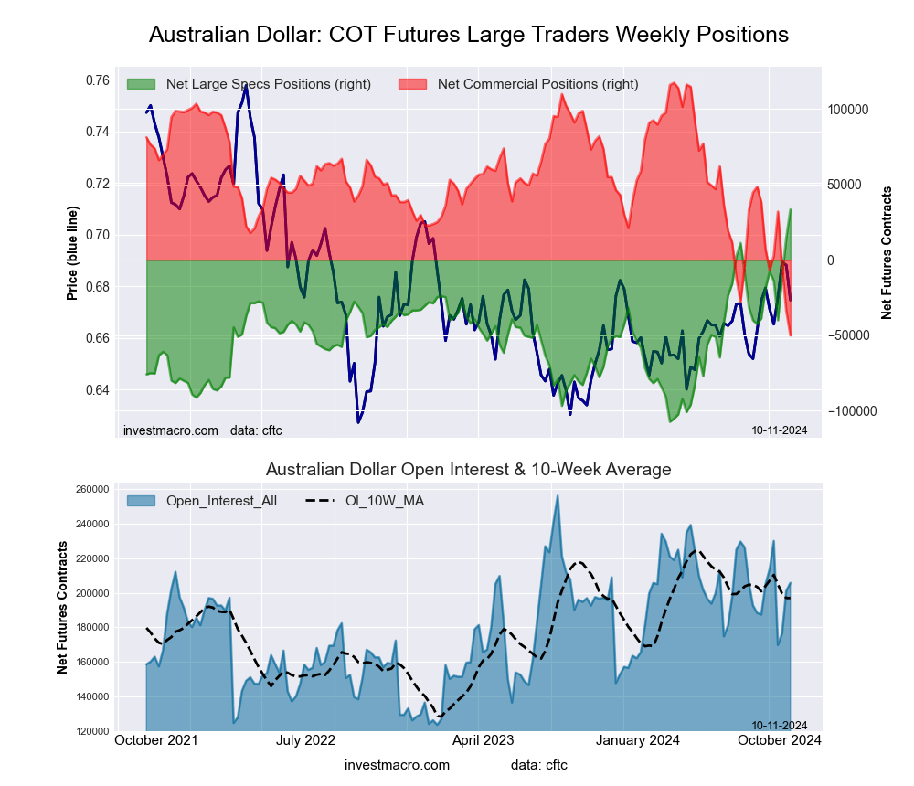 The Australian Dollar large speculator standing this week equaled a net position of 33,422 contracts in the data reported through Tuesday. This was a weekly boost of 18,894 contracts from the previous week which had a total of 14,528 net contracts.