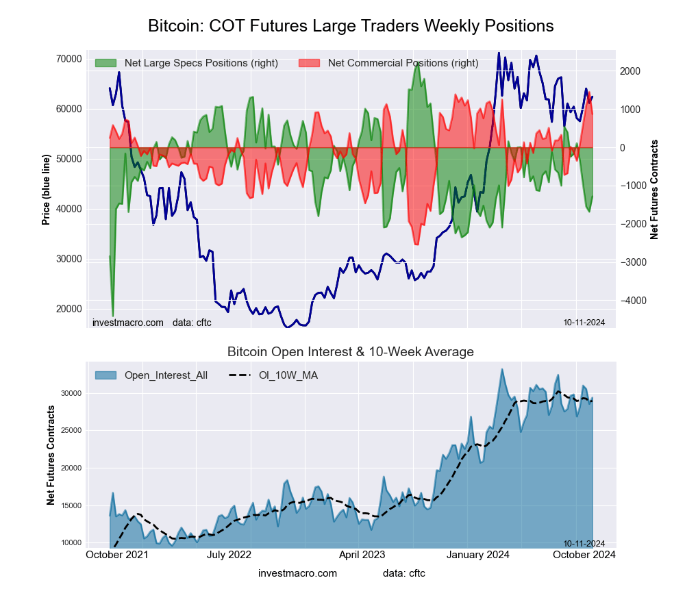 The Bitcoin large speculator standing this week equaled a net position of -1,282 contracts in the data reported through Tuesday. This was a weekly gain of 402 contracts from the previous week which had a total of -1,684 net contracts.