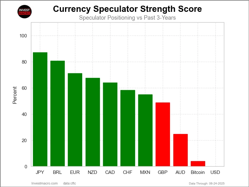 Bitcoin (-29 percent) leads the downside trend scores currently with the Australian Dollar (-16 percent), the US Dollar Index (-12 percent) and the Japanese Yen (-11 percent) following next with lower trend scores.