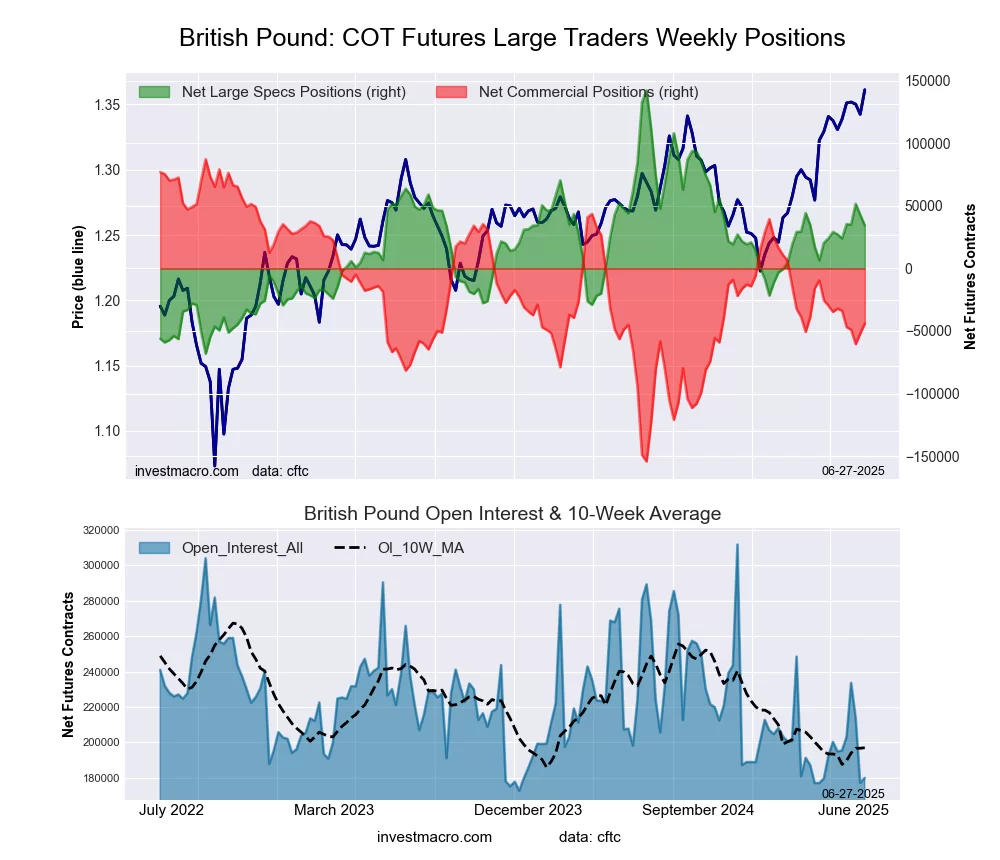 The British Pound Sterling large speculator standing this week recorded a net position of 34,395 contracts in the data reported through Tuesday. This was a weekly decline of -8,462 contracts from the previous week which had a total of 42,857 net contracts.