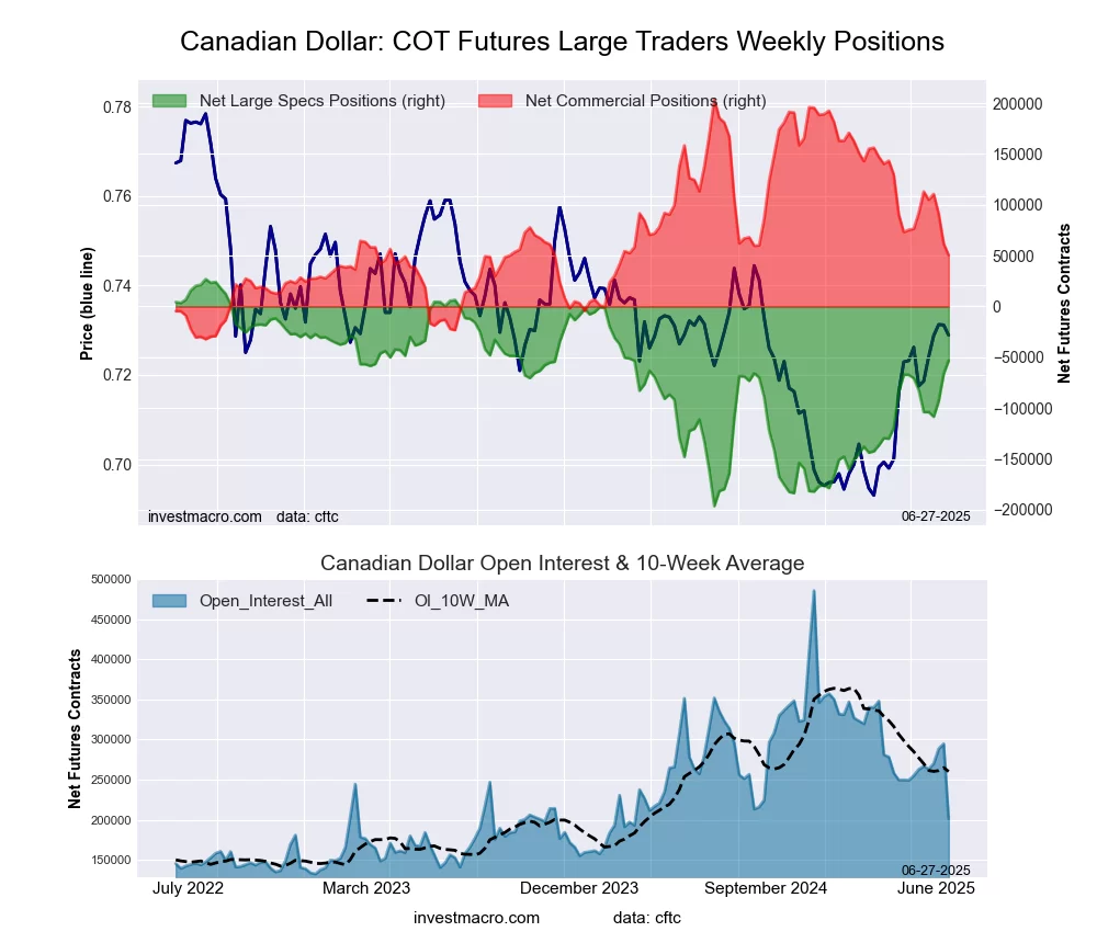 The Canadian Dollar large speculator standing this week recorded a net position of -53,167 contracts in the data reported through Tuesday. This was a weekly boost of 13,166 contracts from the previous week which had a total of -66,333 net contracts.