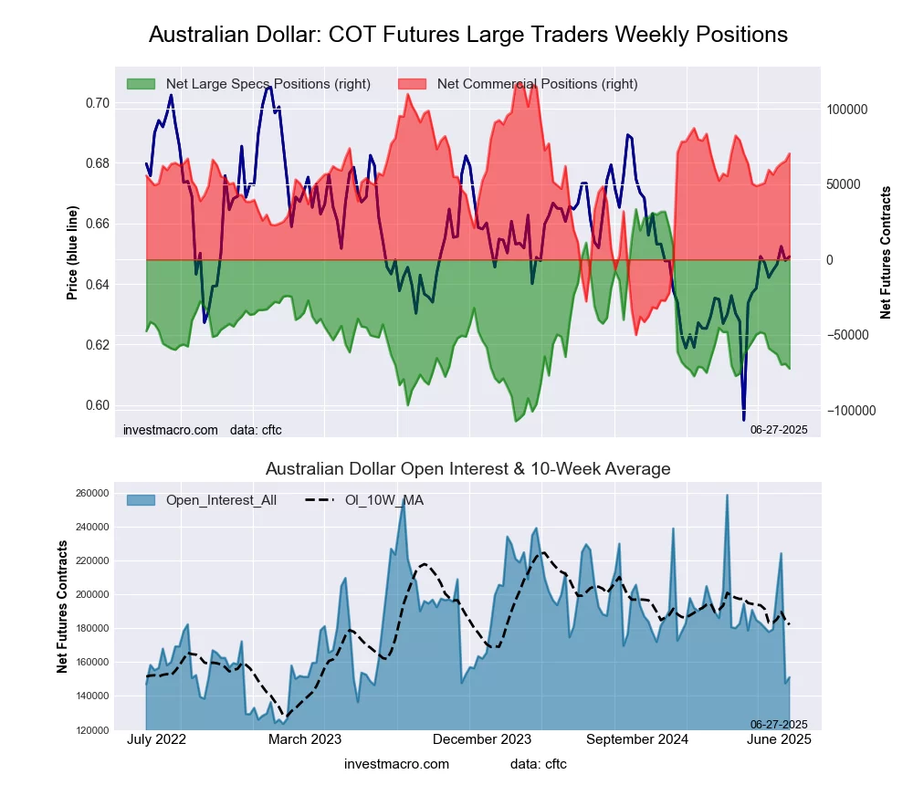 The Australian Dollar large speculator standing this week recorded a net position of -72,562 contracts in the data reported through Tuesday. This was a weekly decrease of -3,172 contracts from the previous week which had a total of -69,390 net contracts.