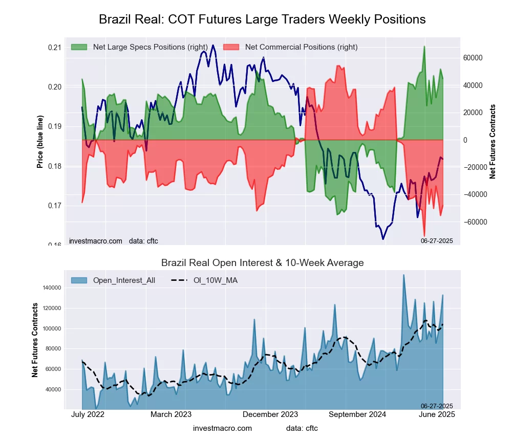 The Brazilian Real large speculator standing this week recorded a net position of 44,730 contracts in the data reported through Tuesday. This was a weekly lowering of -6,962 contracts from the previous week which had a total of 51,692 net contracts.
