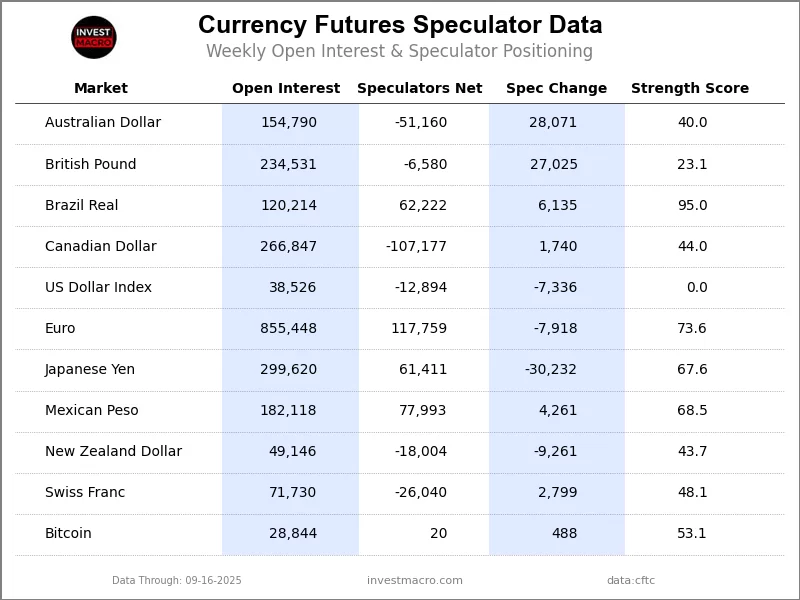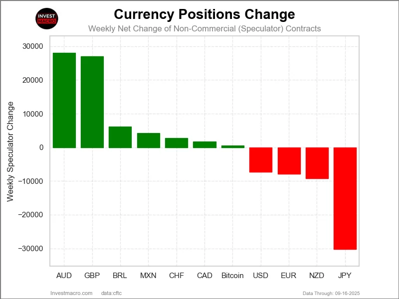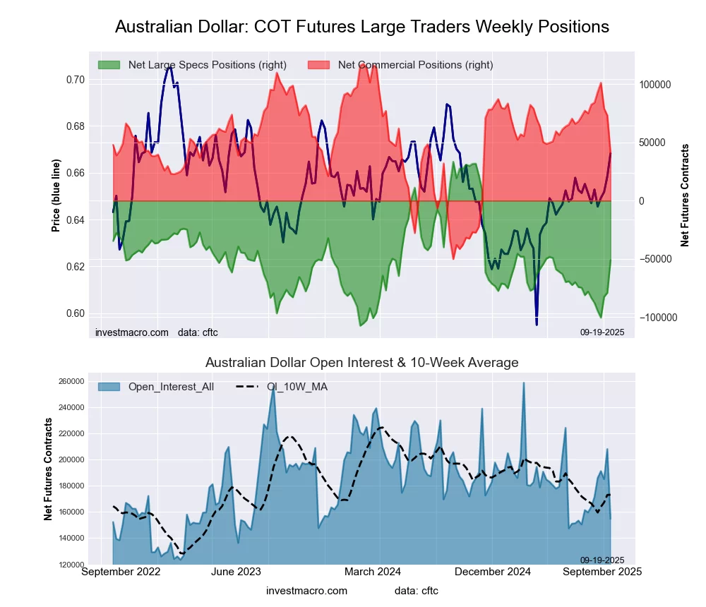 - Next up, the biggest gain on the week was by the Australian Dollar with a rise by 28,071 contracts. Over the past three weeks, Australian Dollar contracts have risen by almost +50,000 positions after dropping to a -100,000 contract (close to a record bearish low) standing on August 26th. Overall, AUD speculator positions have been highly bearish since December of 2024 and have now been in negative territory for 40 consecutive weeks. The Australian Dollar exchange rate has risen by over 7% this year against the U.S. Dollar but remains under its 200-week moving average, with the AUD closing this week at 0.6602.
