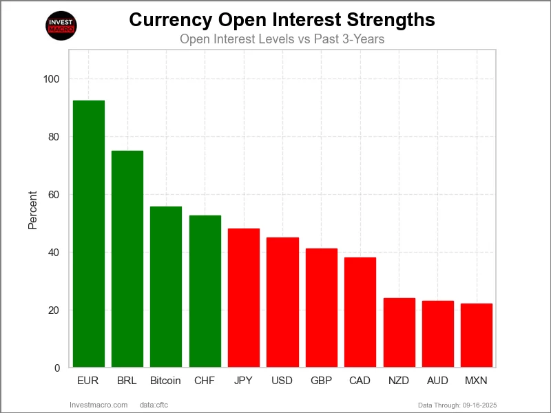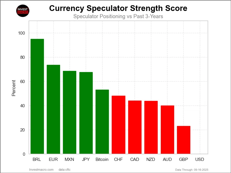 COT Strength Scores (a normalized measure of Speculator positions over a 3-Year range, from 0 to 100 where above 80 is Extreme-Bullish and below 20 is Extreme-Bearish) showed that the Brazilian Real (95 percent) and the EuroFX (74 percent) lead the currency markets this week. The Mexican Peso (69 percent), Japanese Yen (68 percent) and the Bitcoin (53 percent) come in as the next highest in the weekly strength scores.