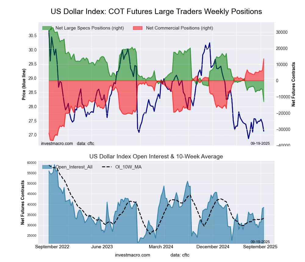 - Starting off, the U.S. Dollar Index positions fell this week by -7,336 net contracts. This was the second straight week of declines and the third out of the last four weeks. This was influenced by the U.S. Federal Reserve’s decision to reduce interest rates on September 17th by 25 basis points. The overall U.S. Dollar Index positioning has now been in a negative or bearish standing for 14 consecutive weeks. This week’s current standing at -12,894 contracts is the most bearish level for the U.S. Dollar Index since February 23, 2021, a span of 238 weeks. At that time, the U.S. Dollar Index price was right around the 90.90 exchange rate, compared to today, where the U.S. Dollar Index resides at 97.27 to close out last week.