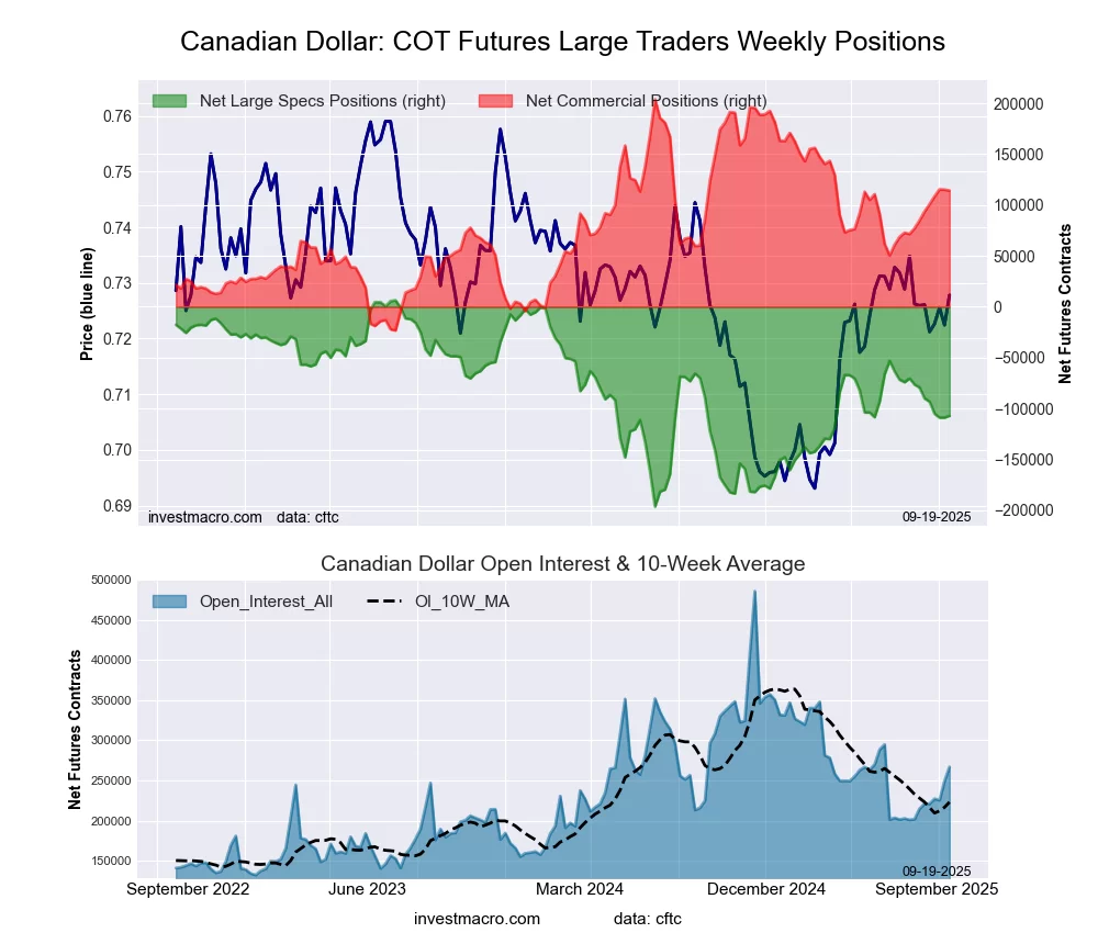 The Canadian Dollar large speculator standing this week totaled a net position of -107,177 contracts in the data reported through Tuesday. This was a weekly increase of 1,740 contracts from the previous week which had a total of -108,917 net contracts.