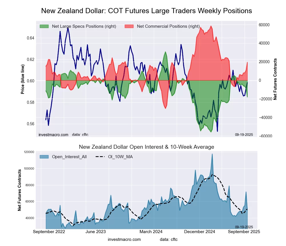 The New Zealand Dollar large speculator standing this week totaled a net position of -18,004 contracts in the data reported through Tuesday. This was a weekly reduction of -9,261 contracts from the previous week which had a total of -8,743 net contracts.