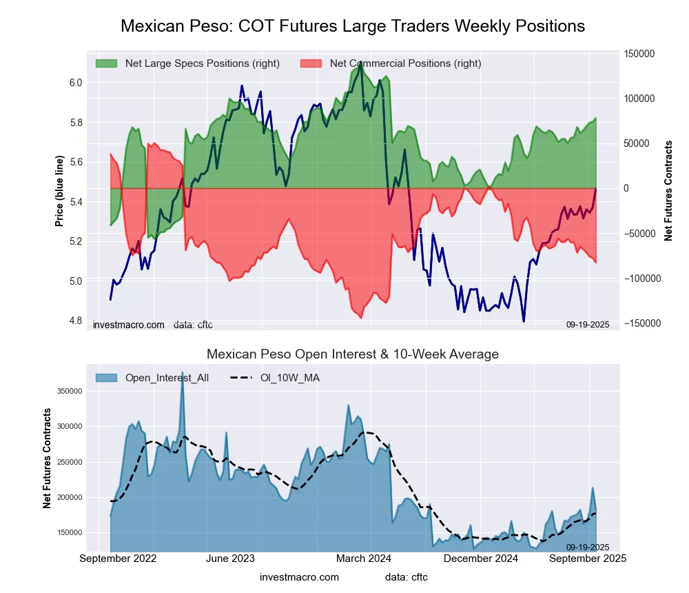 The Mexican Peso large speculator standing this week totaled a net position of 77,993 contracts in the data reported through Tuesday. This was a weekly gain of 4,261 contracts from the previous week which had a total of 73,732 net contracts.