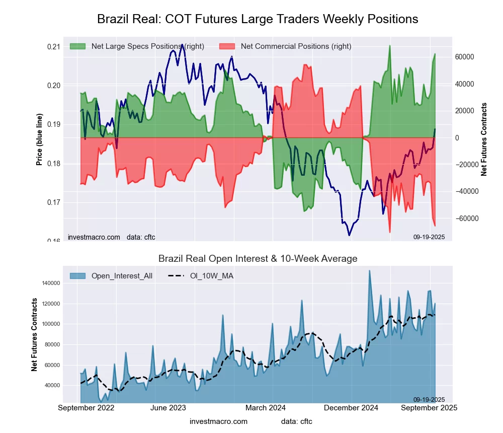 The Brazilian Real large speculator standing this week totaled a net position of 62,222 contracts in the data reported through Tuesday. This was a weekly advance of 6,135 contracts from the previous week which had a total of 56,087 net contracts.