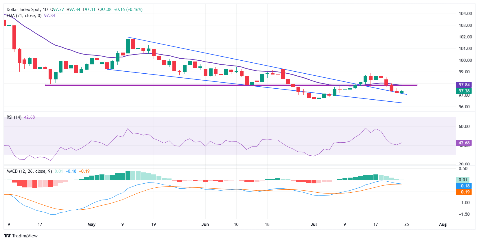 The US Dollar Index (DXY) is showing signs of stabilization on Thursday after extending its recent slide from near four-week highs, with the index hovering around the 97.38 mark. Price action has slowed after breaking below a key support, now turned resistance, near 97.80-98.00, which closely aligns with the 21-day Exponential Moving Average (EMA). The pullback remains contained above the psychological 97.00 handle, where the index has found some intraday support. The level also coincides with the upper boundary of a falling wedge pattern that was decisively broken to the upside last week. This area is now serving as a retest zone and could offer short-term footing as traders reassess the broader trend.