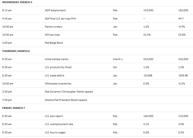 Friday’s US jobs report, including the unemployment rate, is a market marquee event. Forecasts peg job growth at 160,000 for February, up from January’s 143,000, with the unemployment rate forecasted at 4.1%, higher than the previous 4.0%.