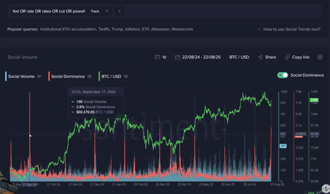 The surge in social media chatter around the highly anticipated US Federal Reserve September interest rate decision could be a warning sign for crypto, says sentiment platform Santiment.
