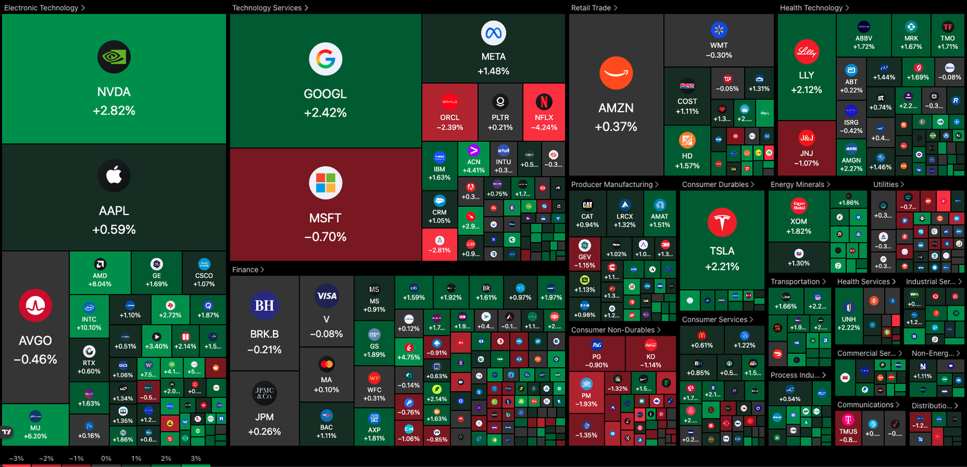 The picture is looking very green throughout except for MSFT not following its Magnificent 7 peers and Consumer Defensives struggling.