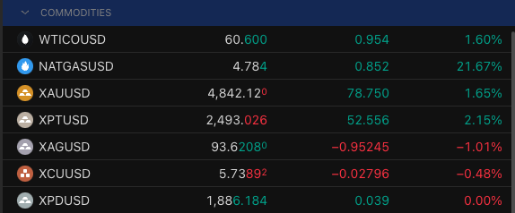 Commodities are seeing a significant rebound today. WTI Oil rose to $60, and Natural Gas extended its squeeze with another 20% daily gain. In the metals complex, Gold and Platinum rose 3% to fresh highs, while Silver found resistance near $93.