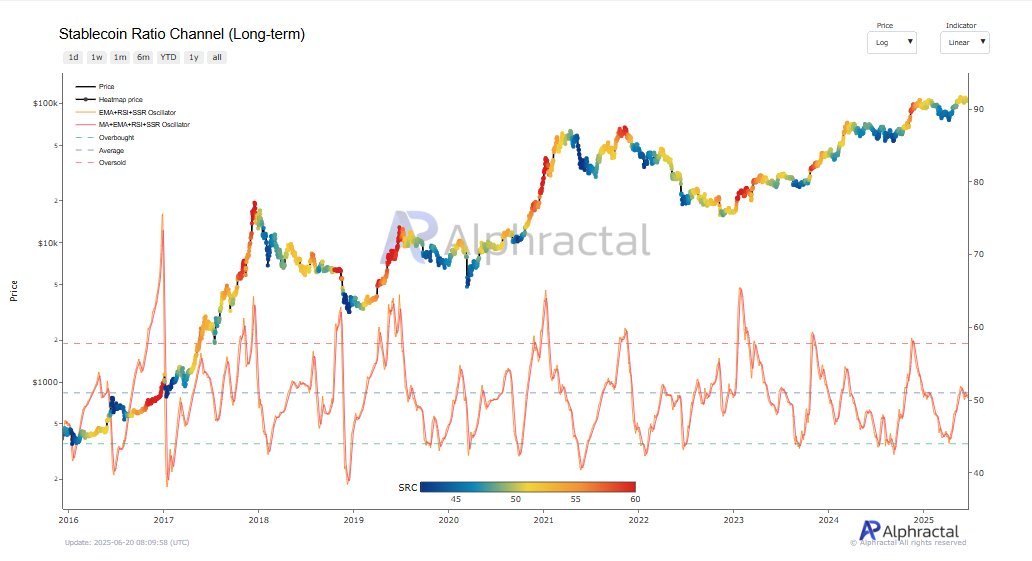 The SRC (Long-Term) removes short-term noise by applying a 90-day Relative Strength Index (RSI) to the Stablecoin Supply Ratio (SSR) oscillator and smoothing it with a 7-day EMA. For context, SSR is calculated as the ratio between the Bitcoin supply and the supply of stablecoins.