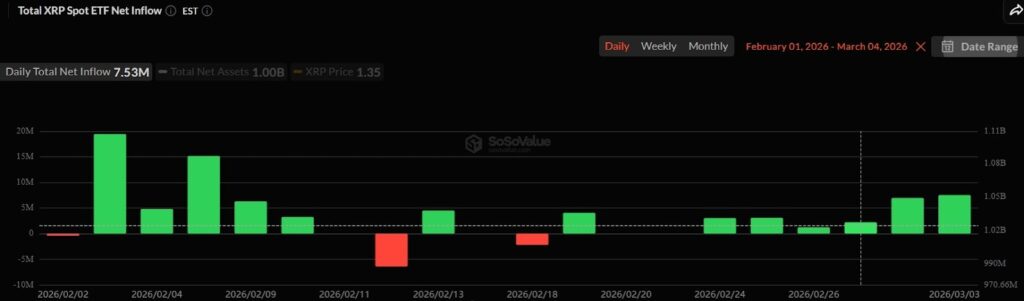 Data from SoSoValue confirms rising demand for spot XRP ETFs among US-based investors despite declining network activity. On March 3, inflows to the product reached $7.53 million, which is the highest amount recorded since February 4. In fact, the data shows that the ETFs have recorded positive flows for the last six consecutive trading days.