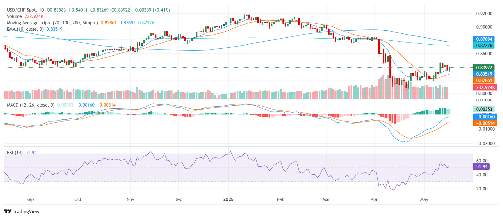 The USD/CHF pair is trading higher on Friday, testing a significant resistance zone near 0.8380 as traders digest mixed economic signals from the United States and ongoing global trade tensions. Despite a modest 0.28% gain on the day, the pair’s upside remains constrained by broader concerns over US economic resilience and tariff policy uncertainty. The US Dollar Index (DXY), a gauge of the greenback’s performance against six major currencies, is trading flat around 100.80, reflecting a cautious market tone.