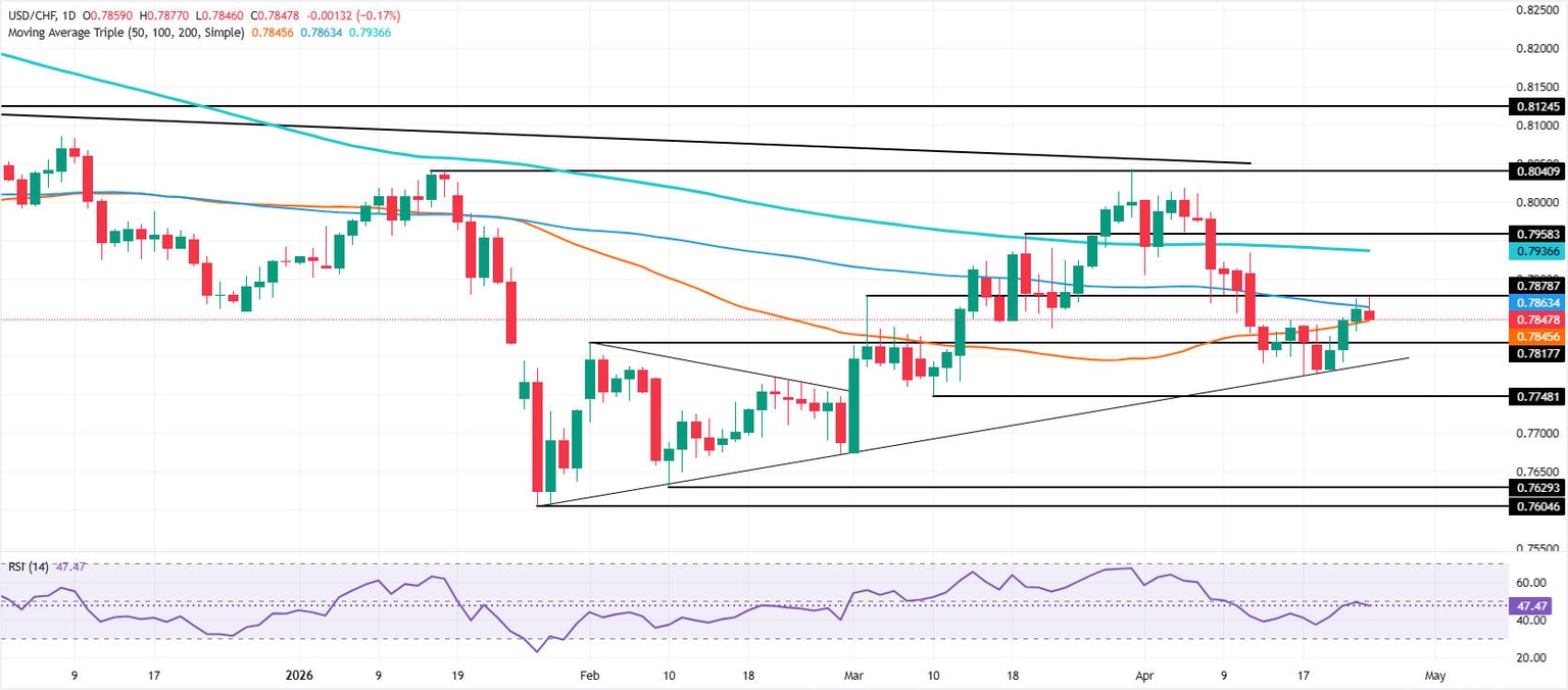 USD/CHF dropped on Friday but finished the week with gains of over 0.35%, trading at 0.7841 as market participants grew confident that US-Iran talks could resume over the weekend to resolve the conflict.