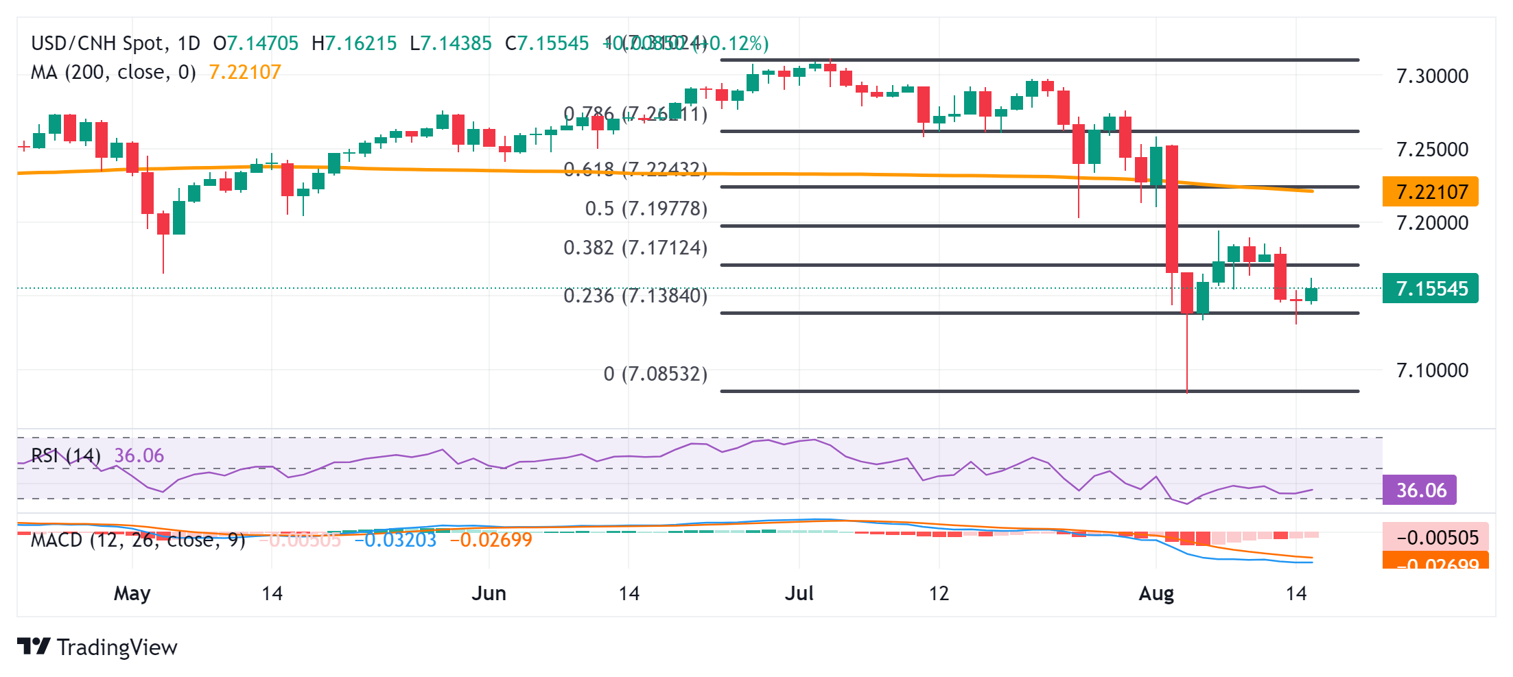 USD/CNH Price Prediction: Trades above 23.6% Fibo., bulls seem non-committed near 7.1555