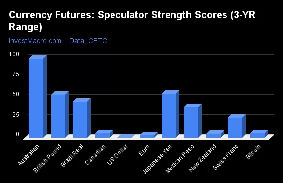 COT Strength Scores (a normalized measure of Speculator positions over a 3-Year range, from 0 to 100 where above 80 is Extreme-Bullish and below 20 is Extreme-Bearish) showed that the Australian Dollar (99 percent) leads the currency markets this week. The Japanese Yen (55 percent) and the British Pound (54 percent) come in as the next highest in the weekly strength scores.