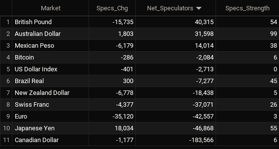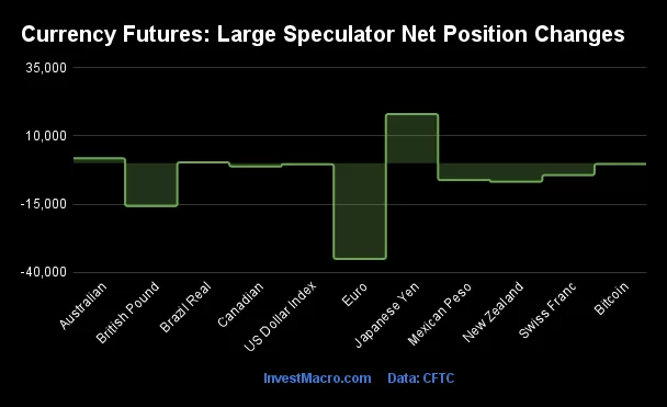 The currencies seeing declines in speculator bets on the week were the EuroFX (-35,120 contracts), the British Pound (-15,735 contracts), the New Zealand Dollar (-6,778 contracts), the Mexican Peso (-6,179 contracts), the Swiss Franc (-4,377 contracts), the Canadian Dollar (-1,177 contracts), the US Dollar Index (-401 contracts) and with Bitcoin (-286 contracts) also registering lower bets on the week.