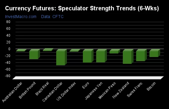 The Canadian Dollar (-42 percent) leads the downside trend scores currently with the New Zealand Dollar (-38 percent), EuroFX (-34 percent) and the Japanese Yen (-33 percent) following next with lower trend scores.