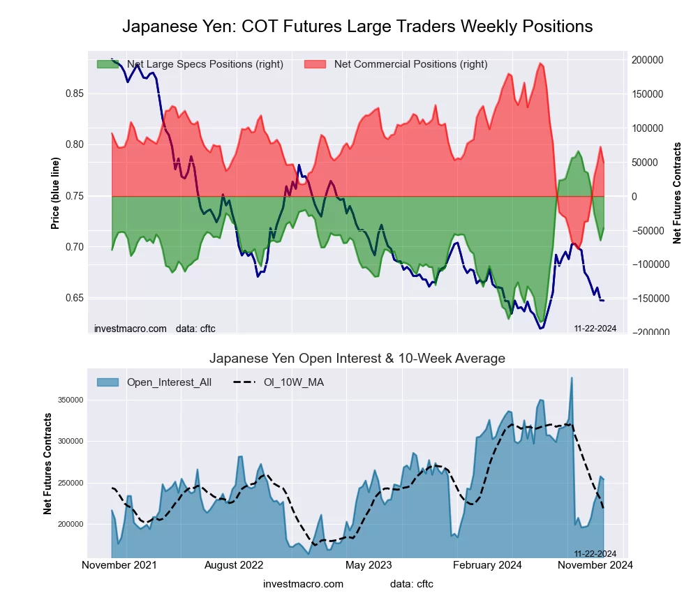 The Japanese Yen large speculator standing this week totaled a net position of -46,868 contracts in the data reported through Tuesday. This was a weekly advance of 18,034 contracts from the previous week which had a total of -64,902 net contracts.