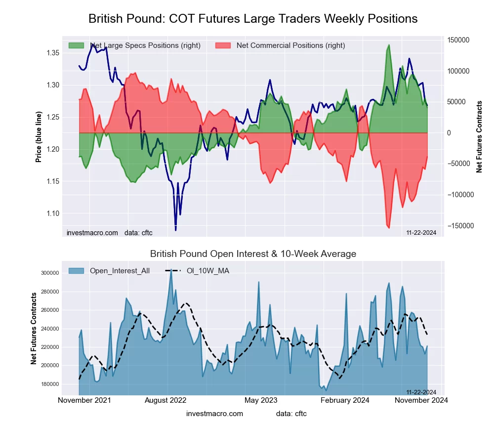 The British Pound Sterling large speculator standing this week totaled a net position of 40,315 contracts in the data reported through Tuesday. This was a weekly decrease of -15,735 contracts from the previous week which had a total of 56,050 net contracts.