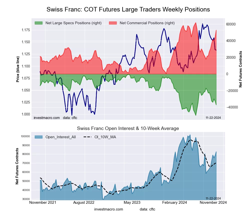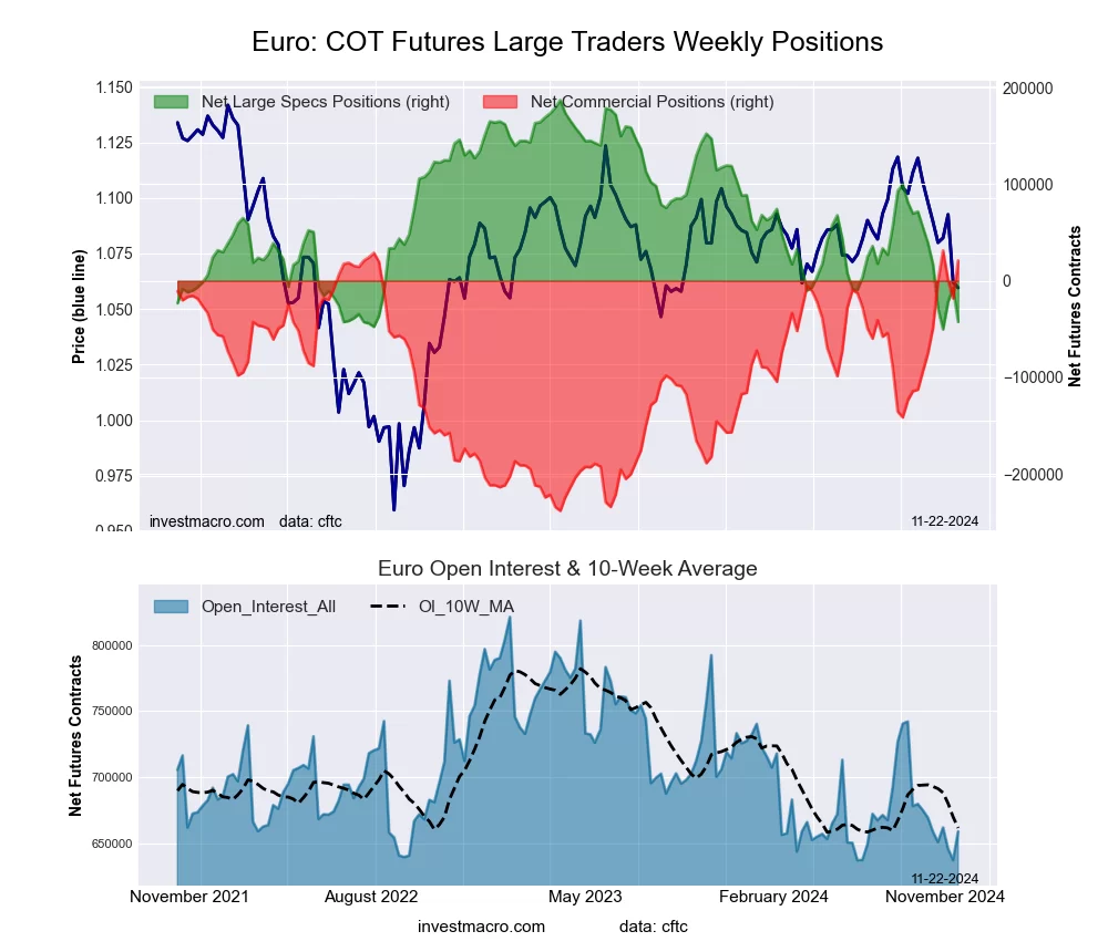 The latest COT data is updated through Tuesday November 19th and shows a quick view of how large market participants (for-profit speculators and commercial traders) were positioned in the futures markets. All currency positions are in direct relation to the US dollar where, for example, a bet for the euro is a bet that the euro will rise versus the dollar while a bet against the euro will be a bet that the euro will decline versus the dollar.