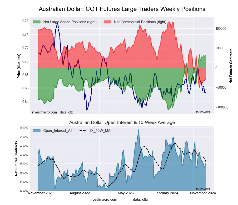 The Australian Dollar large speculator standing this week totaled a net position of 31,598 contracts in the data reported through Tuesday. This was a weekly gain of 1,803 contracts from the previous week which had a total of 29,795 net contracts.