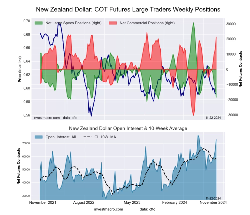 The New Zealand Dollar large speculator standing this week totaled a net position of -18,438 contracts in the data reported through Tuesday. This was a weekly fall of -6,778 contracts from the previous week which had a total of -11,660 net contracts.