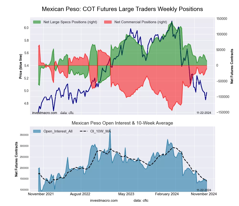 The Mexican Peso large speculator standing this week totaled a net position of 14,014 contracts in the data reported through Tuesday. This was a weekly fall of -6,179 contracts from the previous week which had a total of 20,193 net contracts.