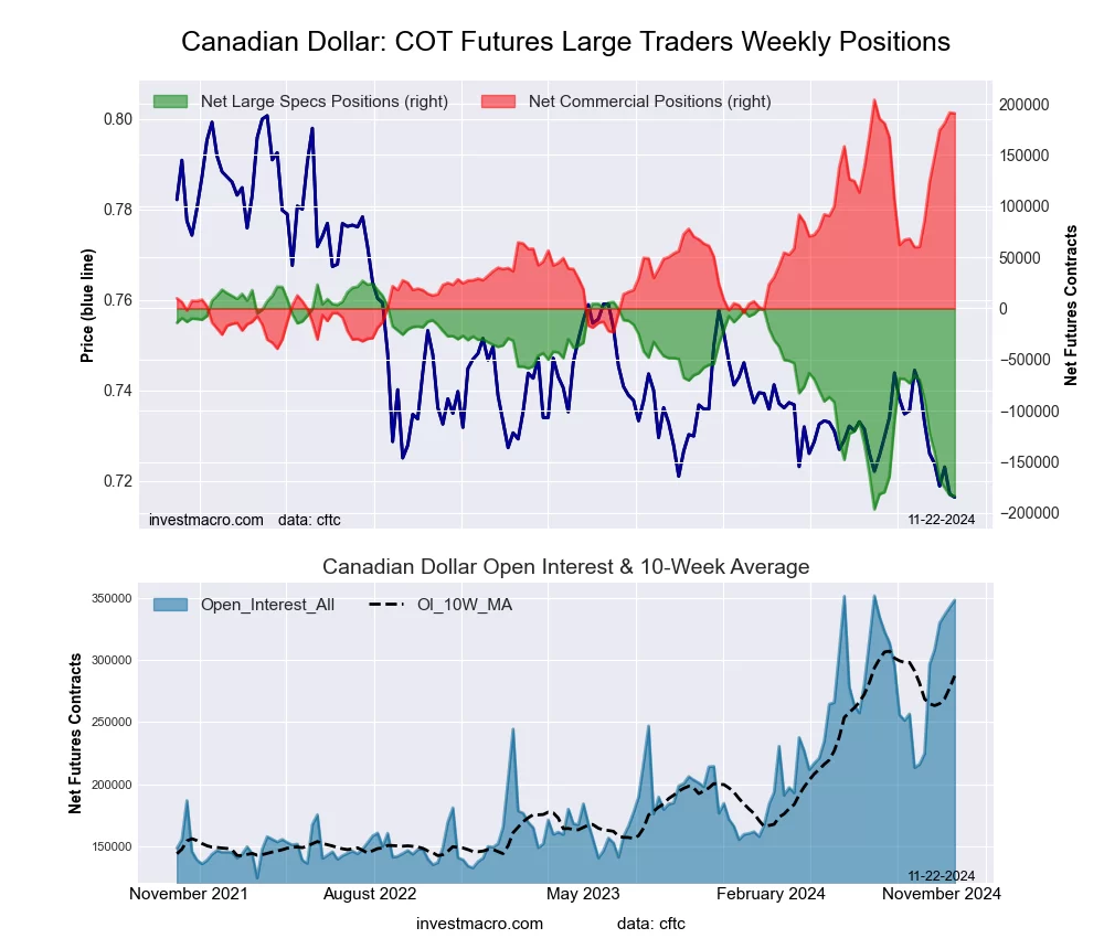 The Canadian Dollar large speculator standing this week totaled a net position of -183,566 contracts in the data reported through Tuesday. This was a weekly decrease of -1,177 contracts from the previous week which had a total of -182,389 net contracts.