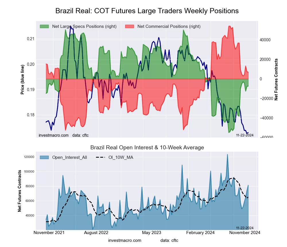 The Brazilian Real large speculator standing this week totaled a net position of -7,277 contracts in the data reported through Tuesday. This was a weekly advance of 300 contracts from the previous week which had a total of -7,577 net contracts.