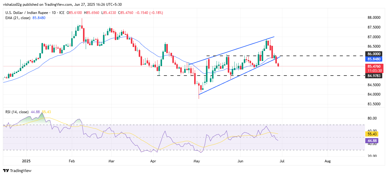 The USD/INR pair has decisively broken below the lower boundary of the rising channel it had been respecting since early May, indicating that bears have the upper hand. The pair is currently trading around 85.48, slipping below the 21-day Exponential Moving Average (EMA) at 85.84—a bearish technical signal.