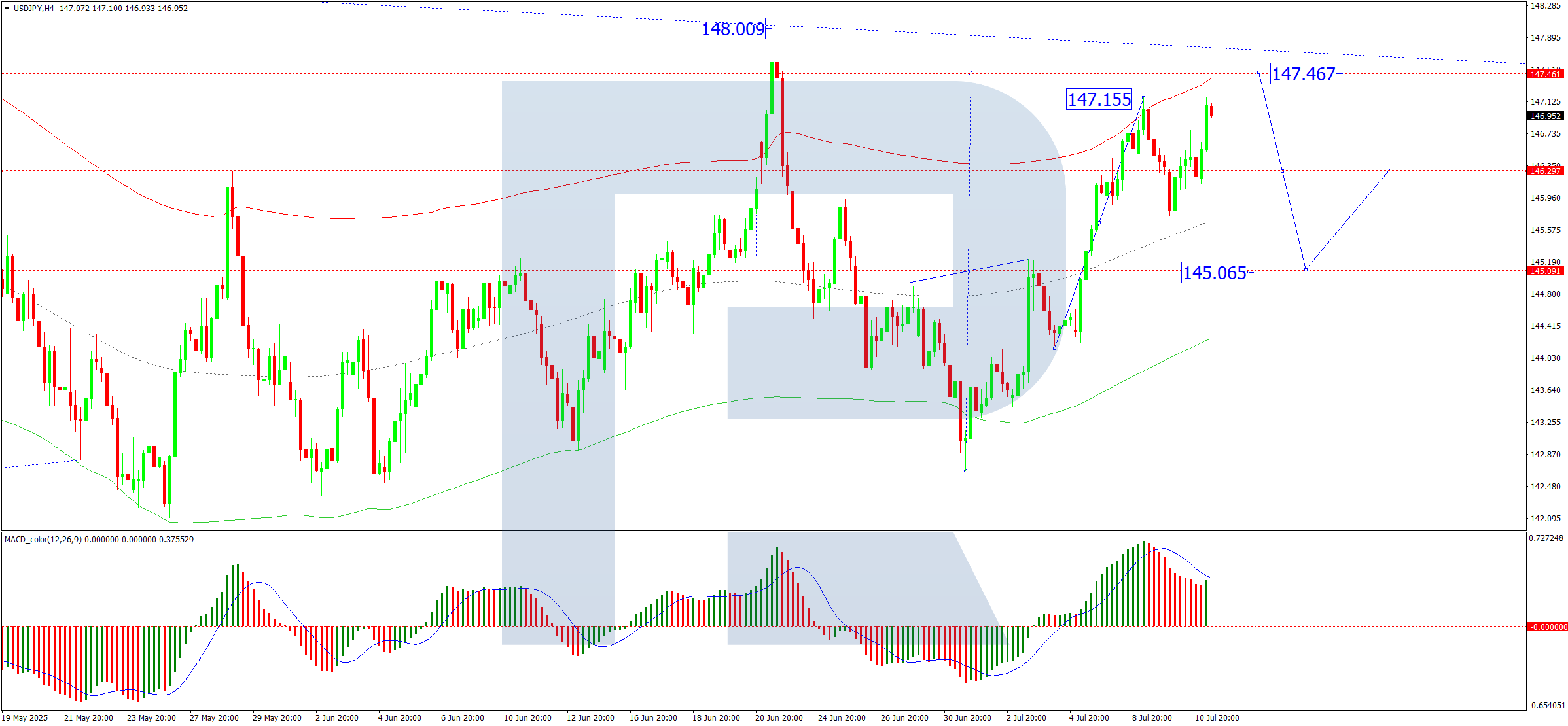 The USD/JPY has established a consolidation range around 145.65, now extending to 147.17. A short-term pullback to 145.65 (testing from above) is anticipated, followed by a potential upward wave targeting 147.47 at minimum. This outlook is supported by the MACD indicator, with its signal line firmly above zero and trending upward.