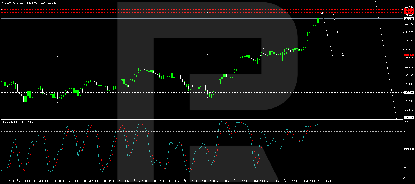 On the hourly chart, USD/JPY has developed a growth structure towards 152.85. Following the achievement of this level, a corrective phase towards 150.85 is anticipated, with an initial correction target set at 151.70. The Stochastic oscillator further underscores this potential pullback, with its signal line positioned above 80 but poised to descend towards 20, suggesting an imminent downward adjustment before further gains.