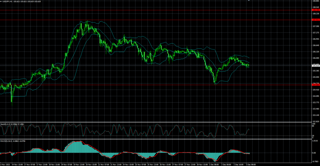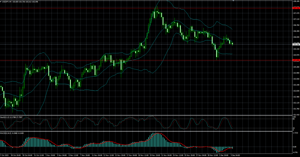 On the H4 chart, USD/JPY remains in a downward correction phase following its accelerated rally in mid-November. The pair is trading below the key resistance level of 156.76, forming a potential reversal structure near the lower Bollinger Band. Selling pressure persists, as evidenced by the market’s failure to sustain a move above the indicator’s middle band.