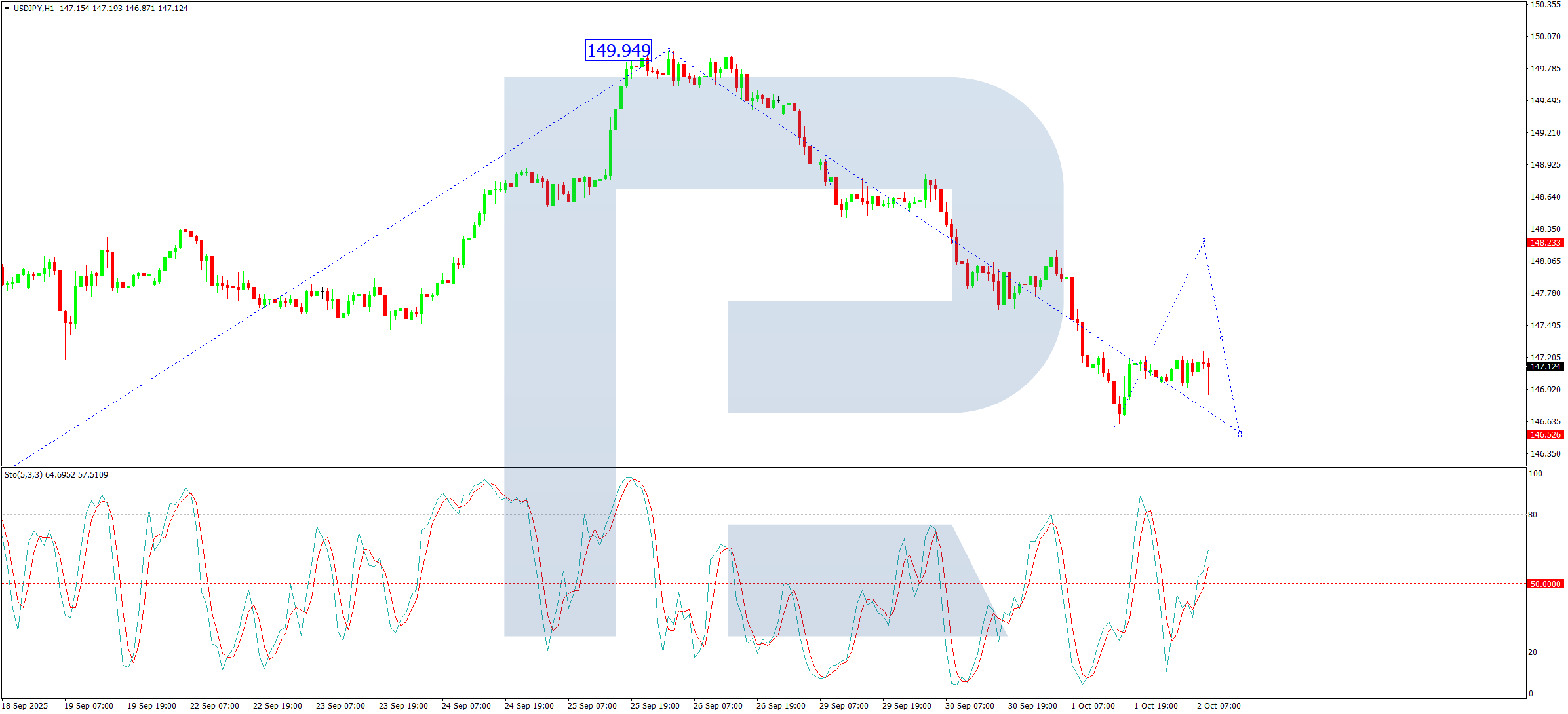 The H1 chart shows the pair achieving its local downside target at 146.60 and forming a consolidation range above it. An upward breakout from this range would initiate a growth wave towards 148.22, after which a corrective decline to 146.50 is expected. The Stochastic oscillator confirms this outlook, with its signal line above 50 and rising sharply towards 80.