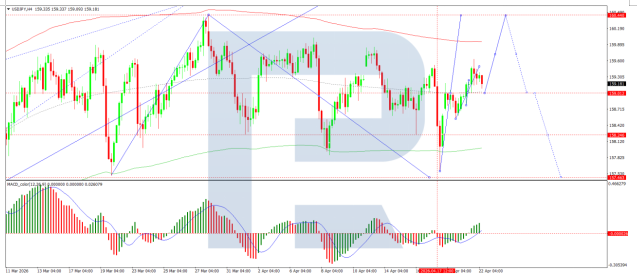 On the H4 chart, USD/JPY formed a consolidation range around the 159.02 level and broke higher to 159.62. A correction to 159.02 is likely, followed by a possible rise to 160.44. Subsequently, a move lower towards 157.70 may develop, with a potential extension to 156.00. Technically, this scenario is confirmed by the MACD indicator, with its signal line above the zero level and pointing firmly upwards, reflecting the potential for the upward move to continue.