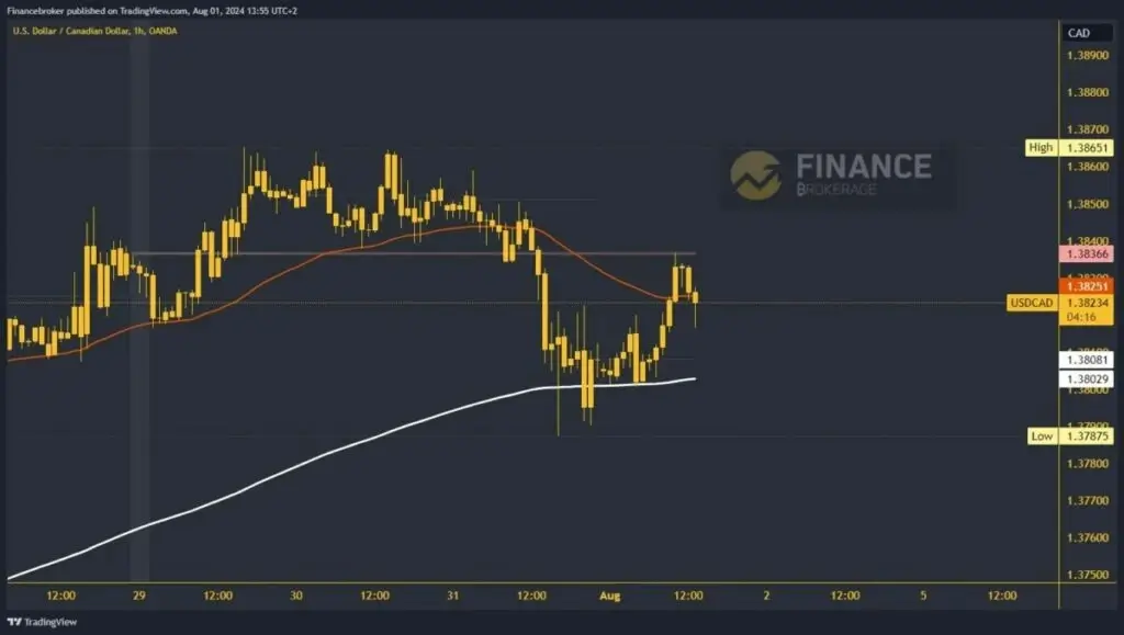 On Wednesday, we saw the USDCAD pull away from the previous bullish trend. Bearish consolidation first brought us below the weekly open price, after which the bearish momentum strengthened and fell last night to 1.37875 levels. We formed a weekly low there but received support from the EMA 200 moving average in that zone. During this morning’s Asian session, the pair initiates a bullish consolidation and recovers to 1.38400.
