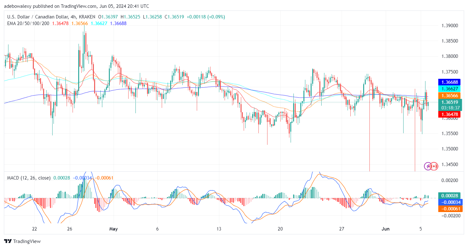 The MACD bars have taken an upward trajectory from below the equilibrium level. The last bar of the indicator now appears solid green, suggesting that upside forces are still ready to propel the market upwards. Traders can anticipate that price action will rise above more EMA lines, as this will provide more impetus toward the 1.3700 resistance level.