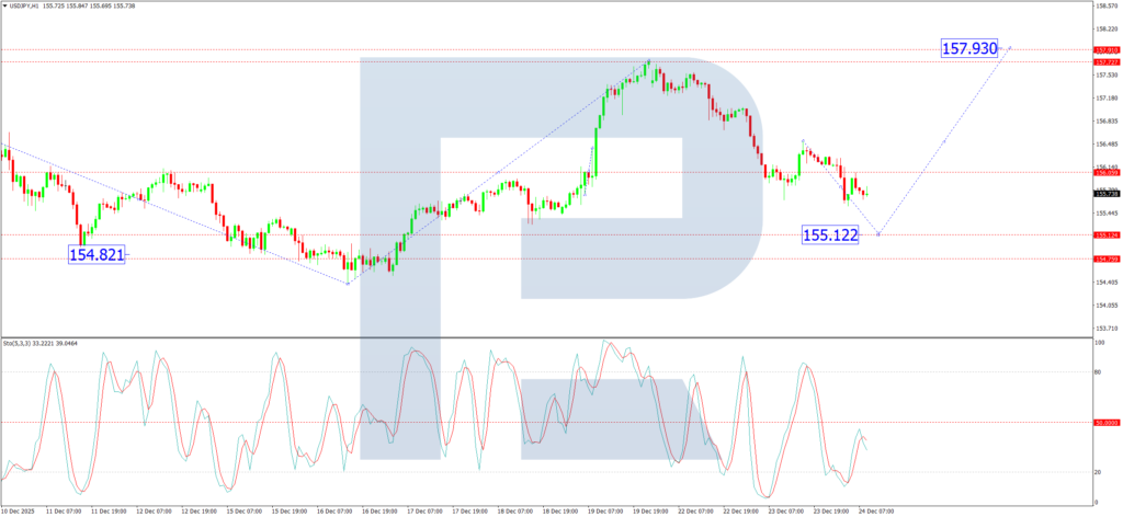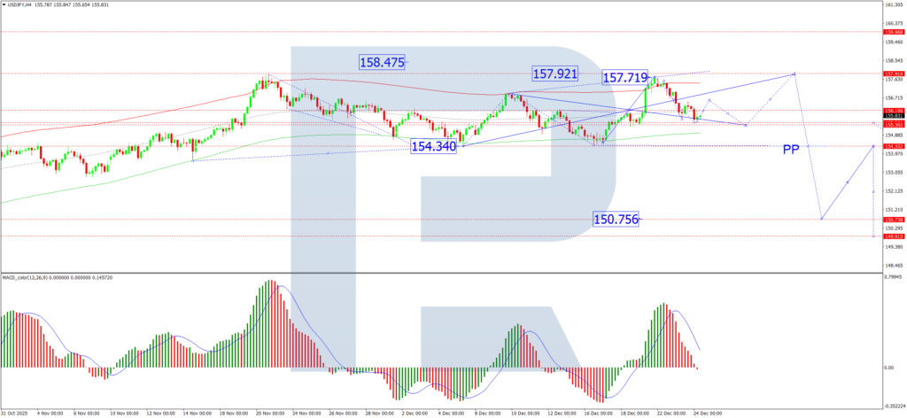 On the H1 chart, the pair is trading within a consolidation range around 156.06. A downside break would target a decline towards 155.12, whereas an upside resolution could initiate a move towards 157.92.