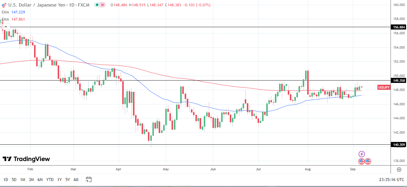 The USD/JPY could break beiow the 200-day and 50-day EMAs on a more dovish Fed policy stance. If breached, 145 would be the next key support level.
