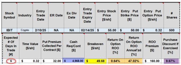 - If the price of IBIT drops below the OTM $50.00 put strike, and no exit strategy intervention is executed, shares will be purchased at the breakeven price point of $49.68, which represents a 9.67% discount from the price when the trade was initiated (purple cell)