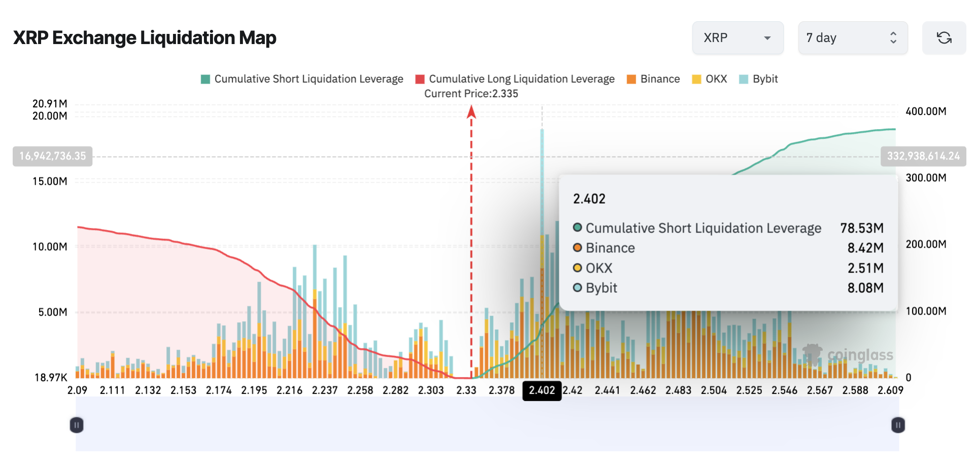 Ripple (XRP) is at a crucial point, with the weekly and monthly charts presenting consolidation behavior. Presently, the token trades at $2.335 with $134B in market capitalization, showing massive user interest. CoinGlass data shows that with such interest comes heightened speculation, as nearly $80 million XRP short positions will face liquidation if the price overcomes the $2.40 resistance level. This means that short positions will be forcibly closed at a loss. Out of the $80 million, $8.08 million short sellers are from Bybit, $2.51 million, and $8.42 million are from OKX and Binance, respectively. The rest of the short positions belong to various popular cryptocurrency exchanges.