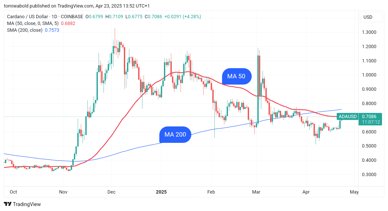 ADA surpassed the critical resistance at the daily SMA 50 currently at $0.688, which has mostly limited its price since January of this year, amid a broader crypto market rebound. This is crucial because the 50-day and 200-day moving averages are widely employed to depict medium and long-term trends, respectively.