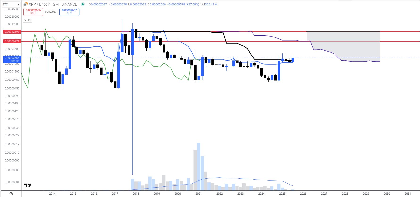 Interestingly, according to the accompanying 2-month XRP/BTC chart, the projected 7,000 to 12,000 satoshi range would match XRP’s peak from the 2017–2018 cycle.